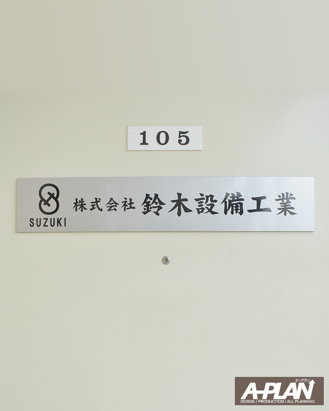 シルバーのシートに切り文字のロゴを入れたドアプレート。