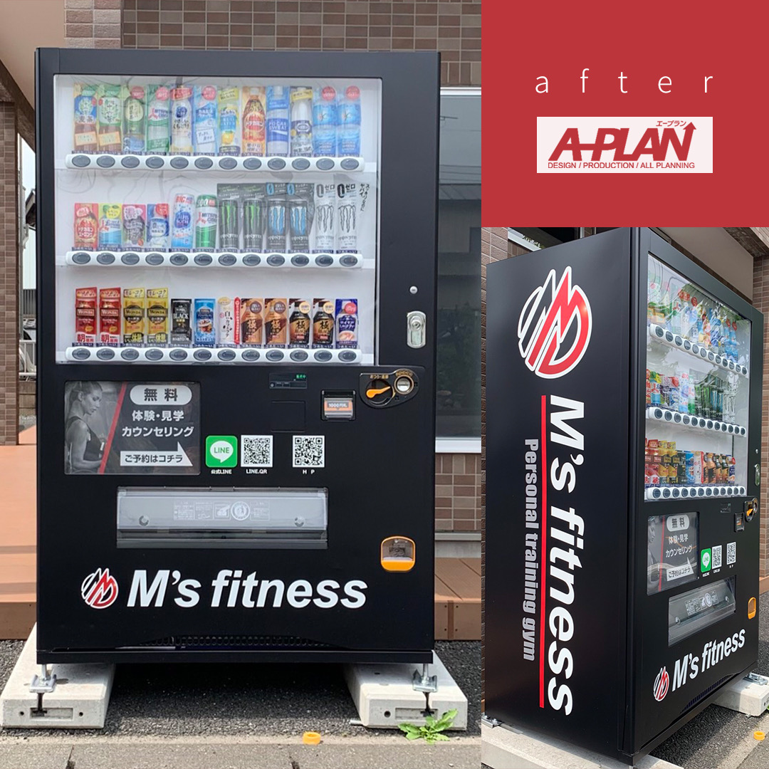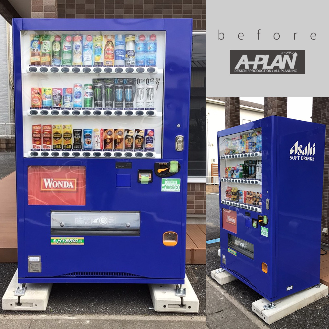 自動販売機の外装に広告やデザインが印刷されたフィルムを貼って、デザインを施す施工方法。